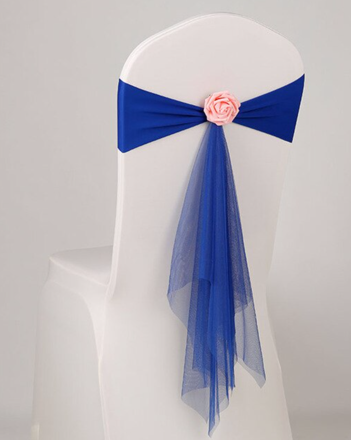 Met een mooie stretch band met tulle lint of alleen met tulle om de rug van de stoel heen.
